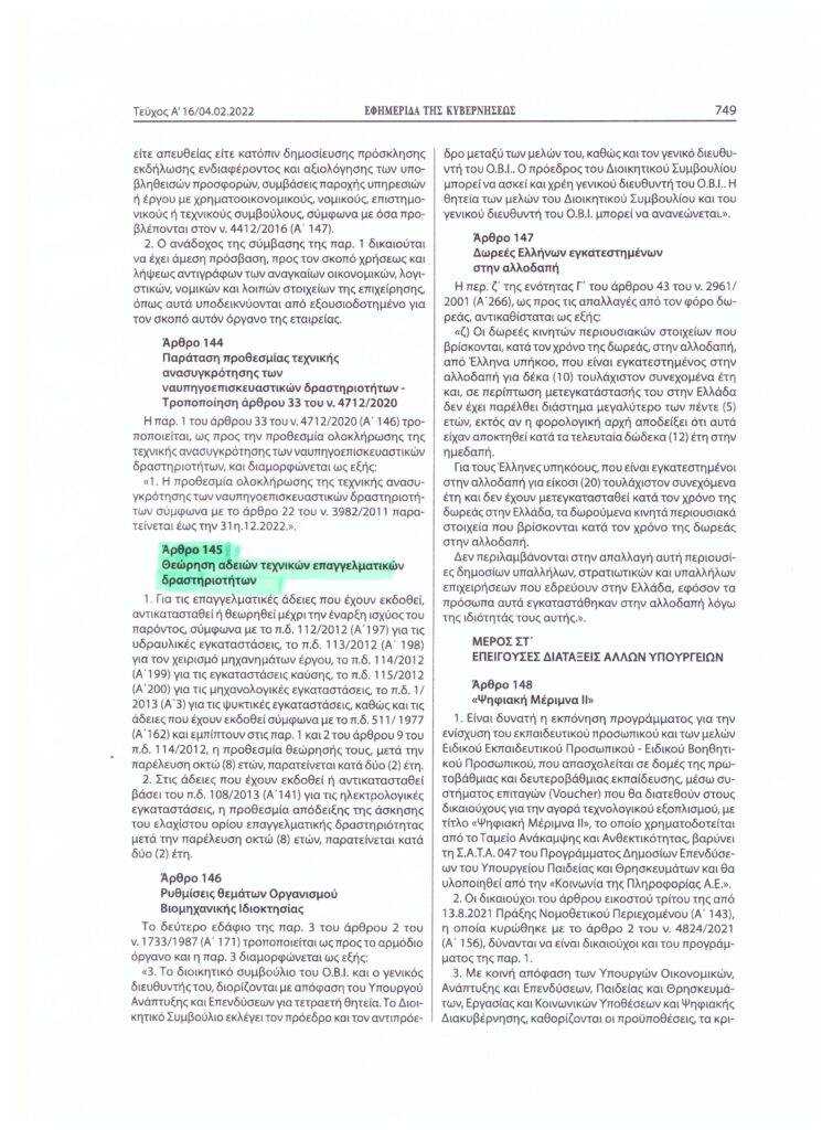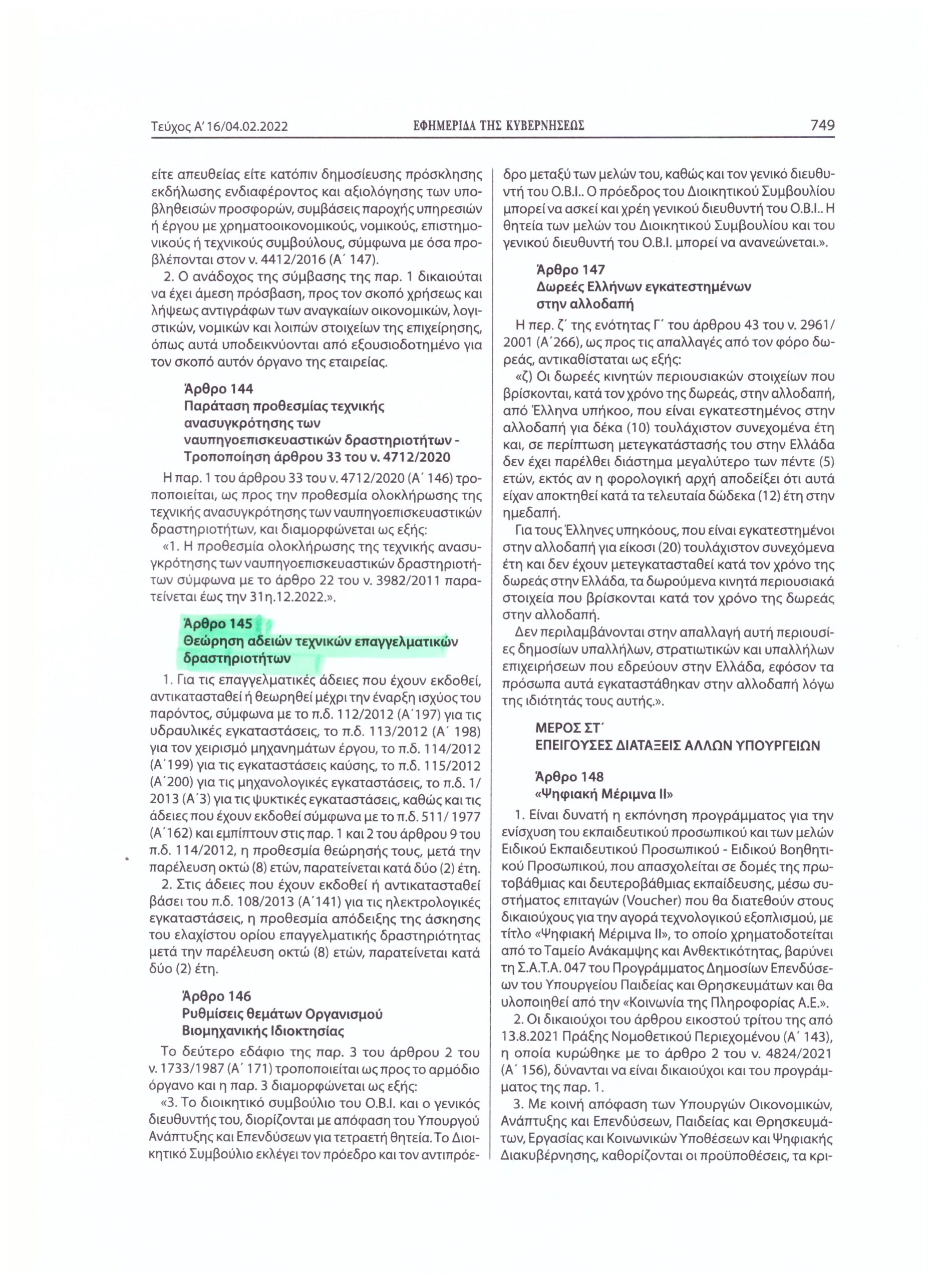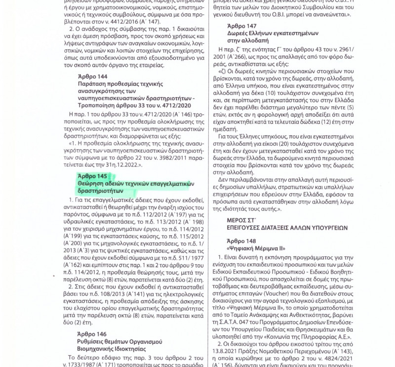 ΑΡΘΡΟ 145 NOMOΥ 4887/ 04-02-2022 ΓΙΑ ΠΑΡΑΤΑΣΗ ΑΝΑΝΕΩΣΗΣ ΕΠΑΓΓΕΛΜΑΤΙΚΩΝ ΑΔΕΙΩΝ
