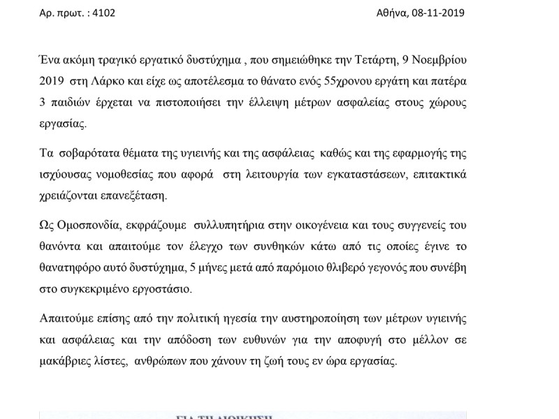 ΔΕΛΤΙΟ ΤΥΠΟΥ ΟΜΤΕ ΓΙΑ ΕΡΓΑΤΙΚΟ ΔΥΣΤΥΧΗΜΑ ΣΤΗ ΛΑΡΚΟ